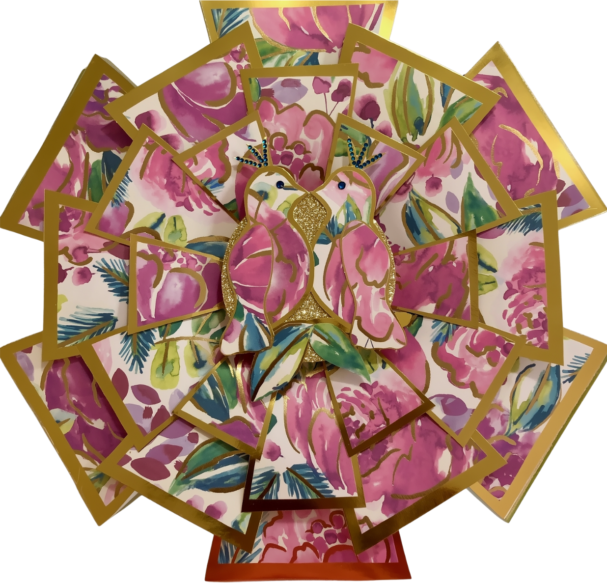 A sweet, playful piece featuring lovebirds surrounded by bright florals and golden framing. It’s a cheerful accent for a gallery wall, entryway, or a thoughtful gift for anniversaries, weddings, or anyone who loves a little romance.