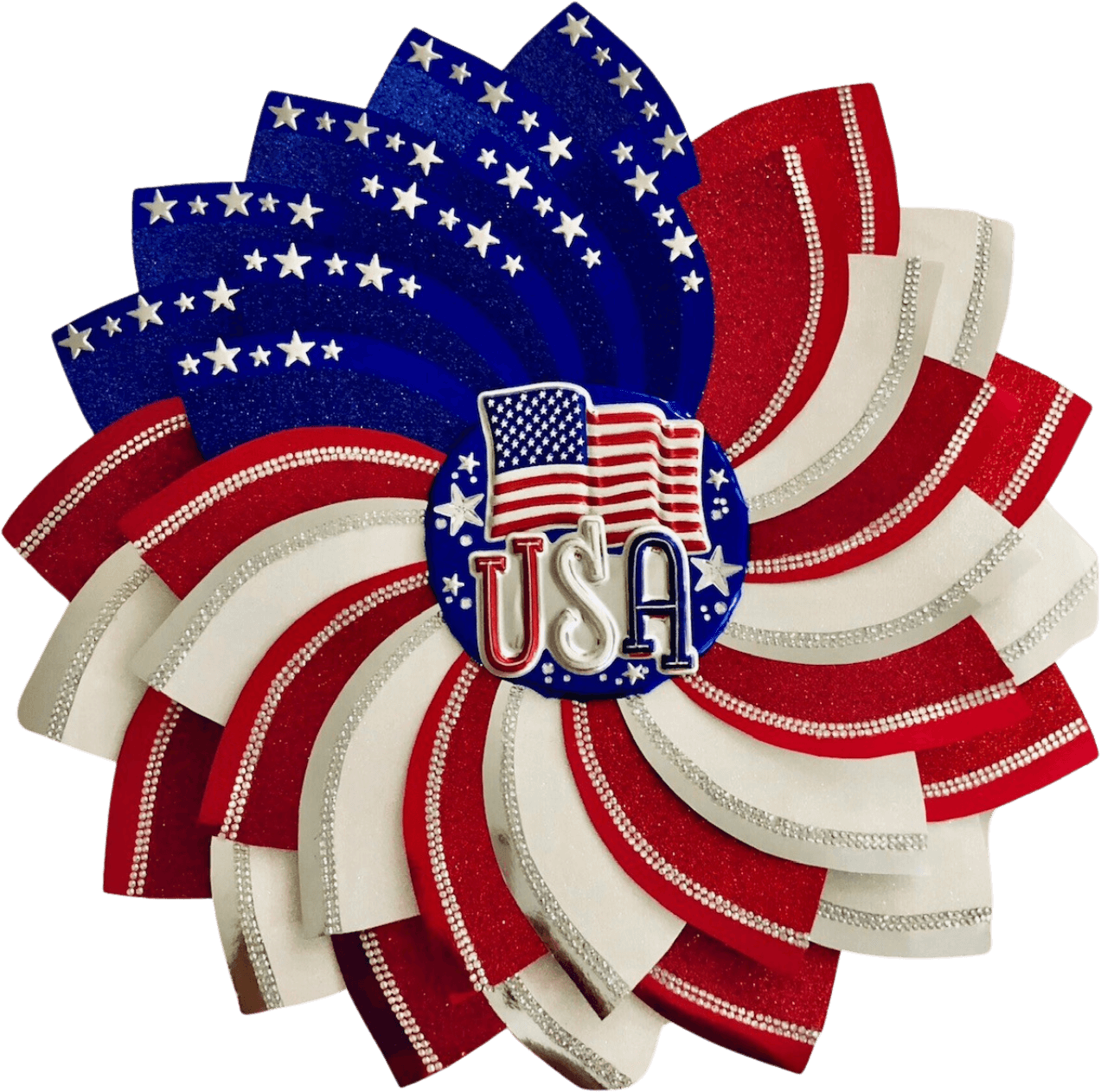 Celebrate freedom and craftsmanship with the Star-Spangled Flower, a radiant creation in glittering red, white, and blue. Each petal sparkles with hand-applied stars and rhinestone trim, converging around a patriotic USA centerpiece. This heirloom-quality piece is perfect for Independence Day décor, veteran celebrations, or patriotic displays year-round.